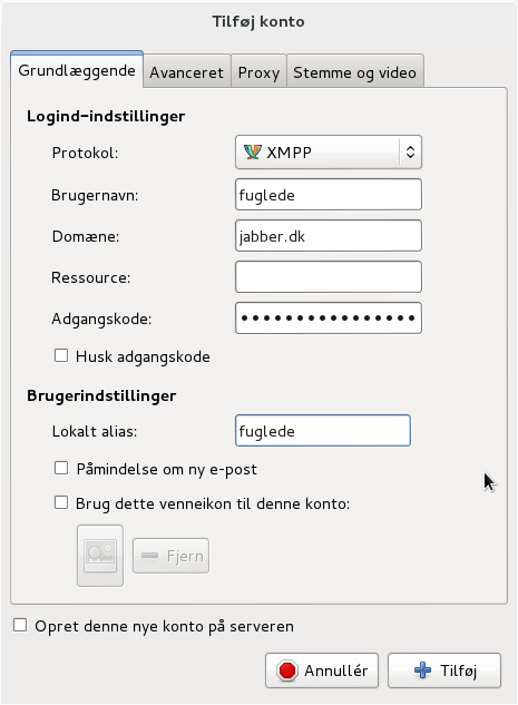 Når du første gang åbner Pidgin bliver du bedt om at tilknytte en bruger, og her kan vi så skrive det brugernavn og den kode, som vi lige har fundet på; bemærk at vi har valgt protokollen "XMPP". Tjek også under "avanceret", at Pidgin "kræver kryptering", hvilket sikrer, at ingen mellem os og jabber.dk kan følge med i, hvad der sker.