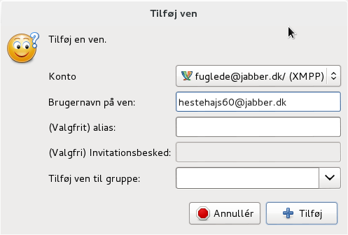 Med de indstillinger skulle det nu være muligt at slå kontoen til og at komme i gang med at chatte. Først har vi dog brug for nogen at chatte med. Når du har slået kontoen til, kan du i menuen i toppen vælge "Venner" og "Tilføj ven" og i eksemplet her tilføjer vi min gode ven hestehajs60@jabber.dk. Her er "hestehajs60" personens brugernavn og "jabber.dk" er den XMPP-server, som han har valgt at bruge. Hvis man i stedet vil snakke med mig, kan man så tilføje fuglede@jabber.dk.
