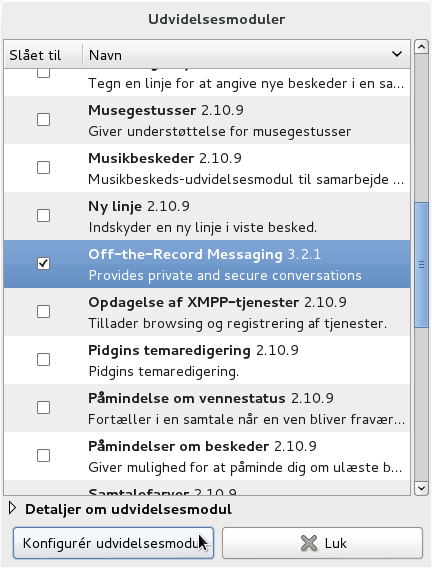I princippet kan vi nu bare gå i gang med at chatte, men gør vi det, vil manden bag jabber.dk (han hedder Per) og folkene bag hans server kunne følge med i snakken, og det vil vi jo gerne undgå, og det er her, OTR kommer ind i billedet. I Pidgin skal OTR slås til manuelt, hvilket man gør ved i menuen at vælge "Værktøjer" og "Udvidelsesmoduler". Her vælger man "Off-the-Record Messaging", trykker på "Konfigurér udvidelsesmodul" og trykker på knappen "Generate".