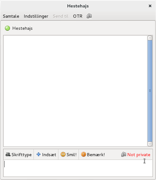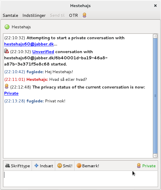NU er vi så klar til at chatte privat. Dobbeltklikker man på en ven i hovedmenuen får man et velkendt chatvindue. Hvis OTR er sat rigtigt op ved begge parter, står der sikkert "Not private" et sted i vinduet. Det indikerer, at chatten endnu ikke er sikker, men ved at trykke på "Not private"-knappen har man mulighed for at aktivere OTR; det kan også sættes op, så det sker automatisk.
