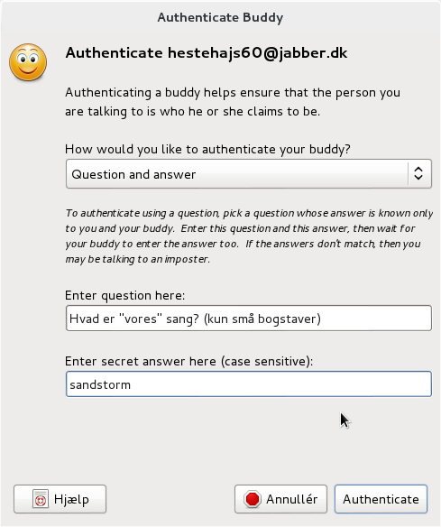 I praksis foregår det ved, at vi trykker på "Unverified" og vælger "Authenticate buddy", hvorefter man præsenteres for et par forskellige muligheder for at udveksle hemmeligheder. I eksemplet har jeg valgt at spørge Hestehajs til, hvad "vores sang" er, og jeg angiver, at svaret er "sandstorm". Det er selvfølgelig et lidt dårligt eksempel, eftersom de flestes sang jo nok er Sandstorm, og man kunne nok finde på noget mere hemmeligt. Hvis Hestehajs nu svarer rigtigt på spørgsmålet ved vi, at vi snakker med den rigtige, og at end ikke Per kan lytte med. I Pidgin er det indikeret med teksten "Private".